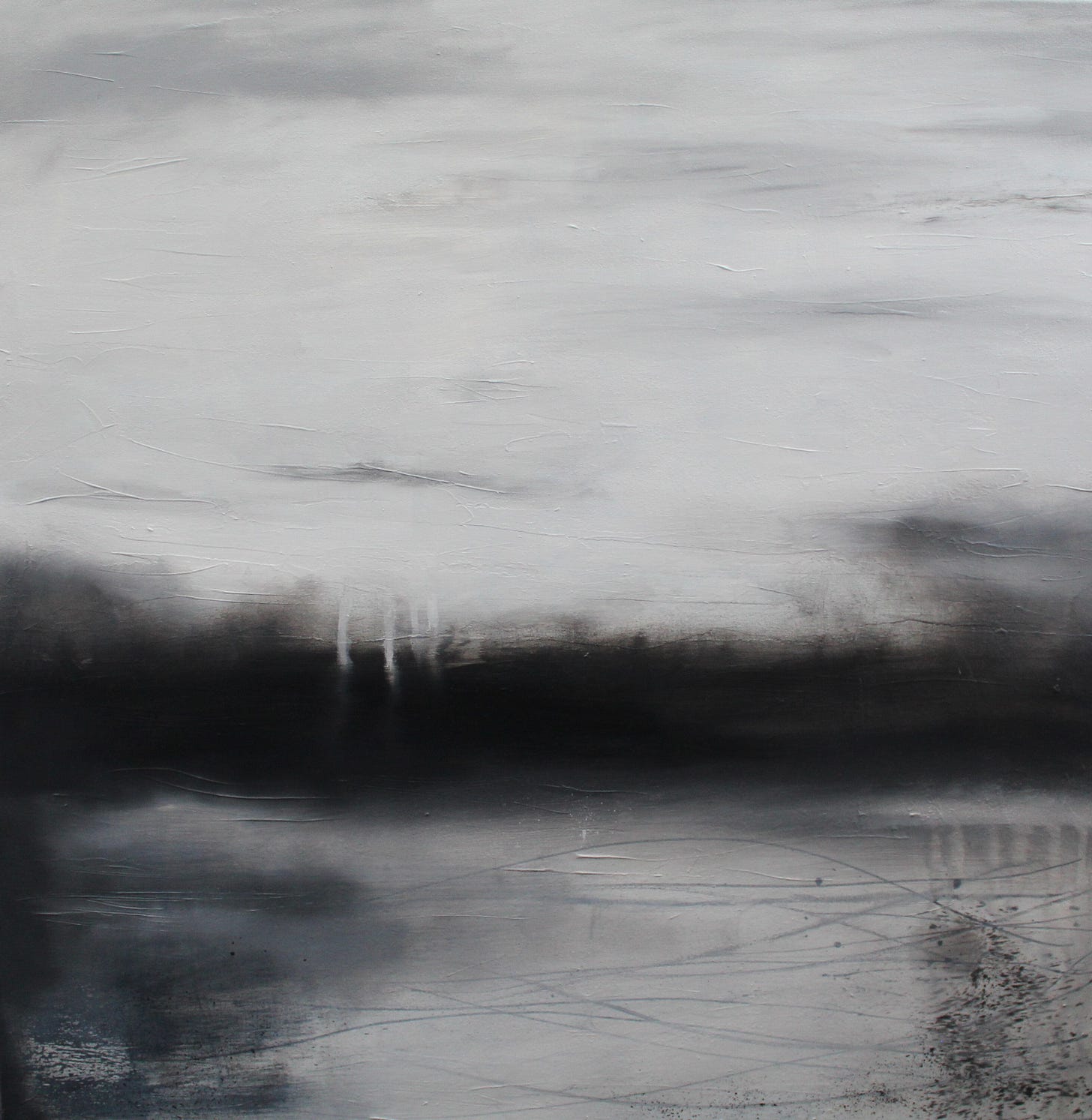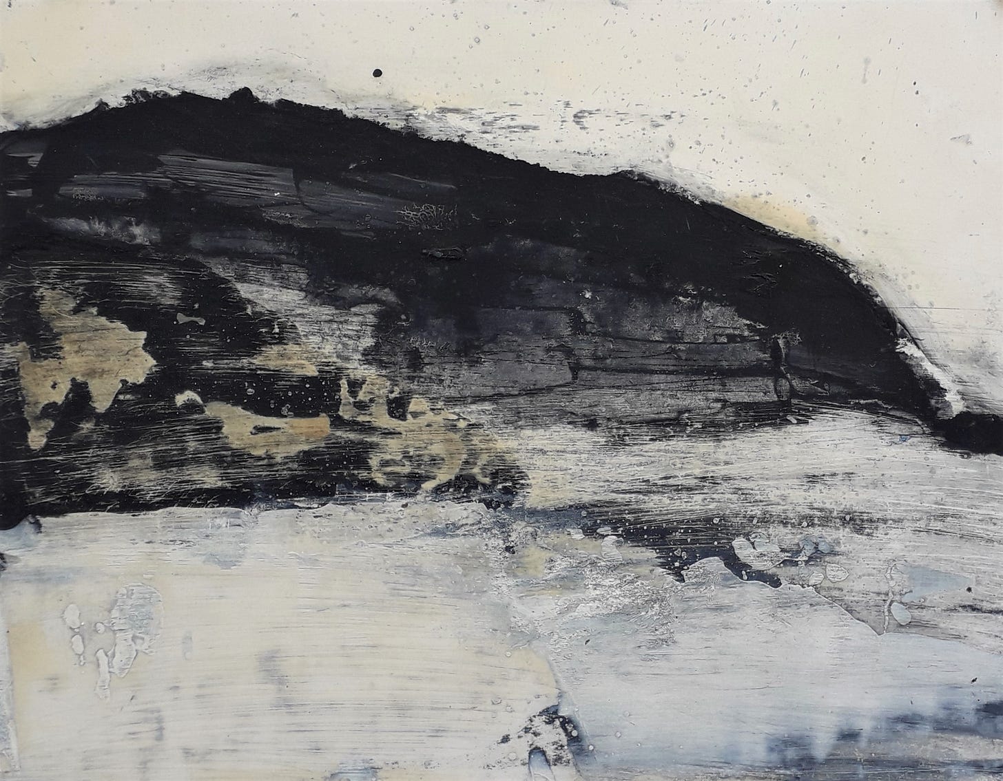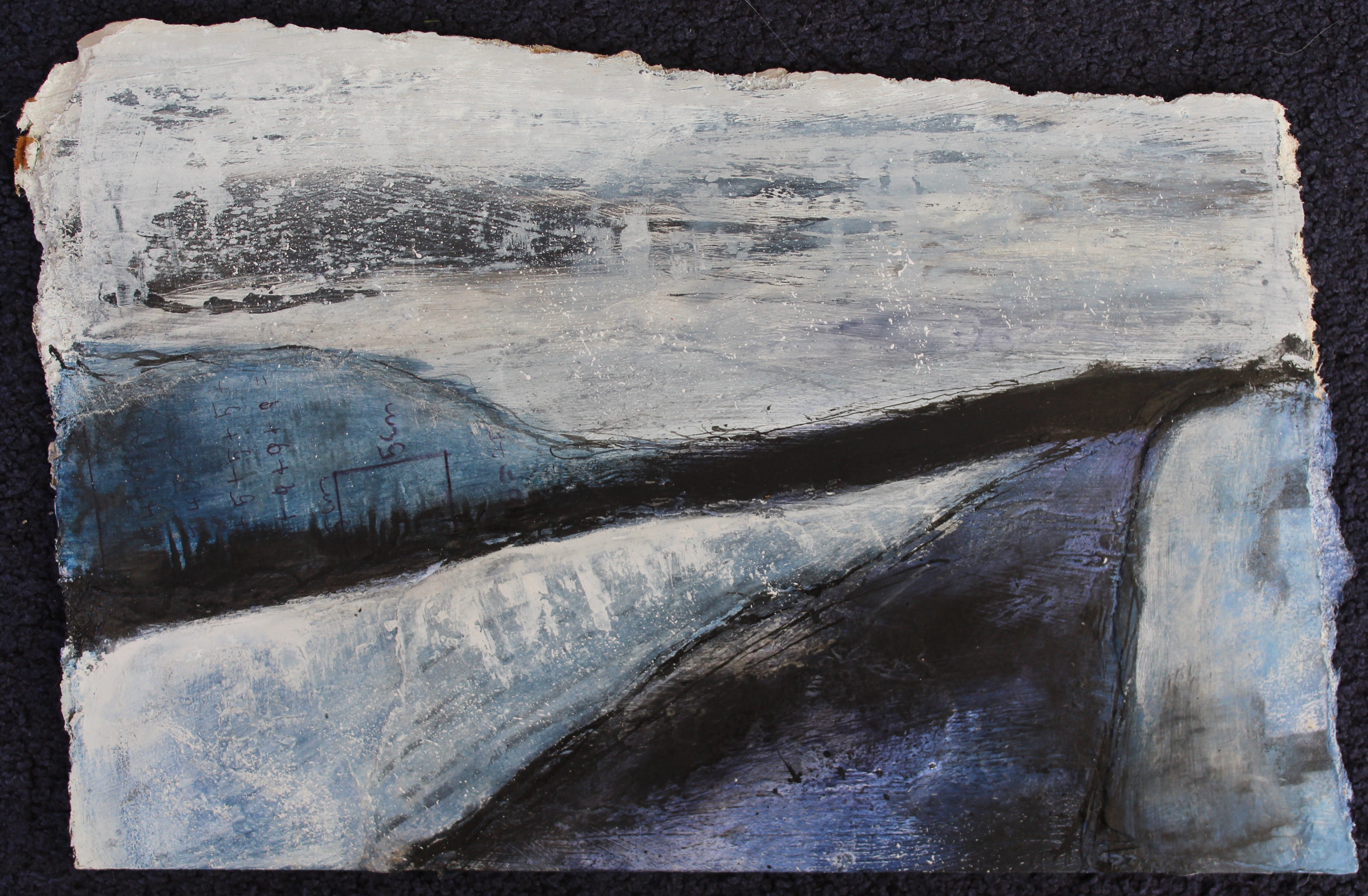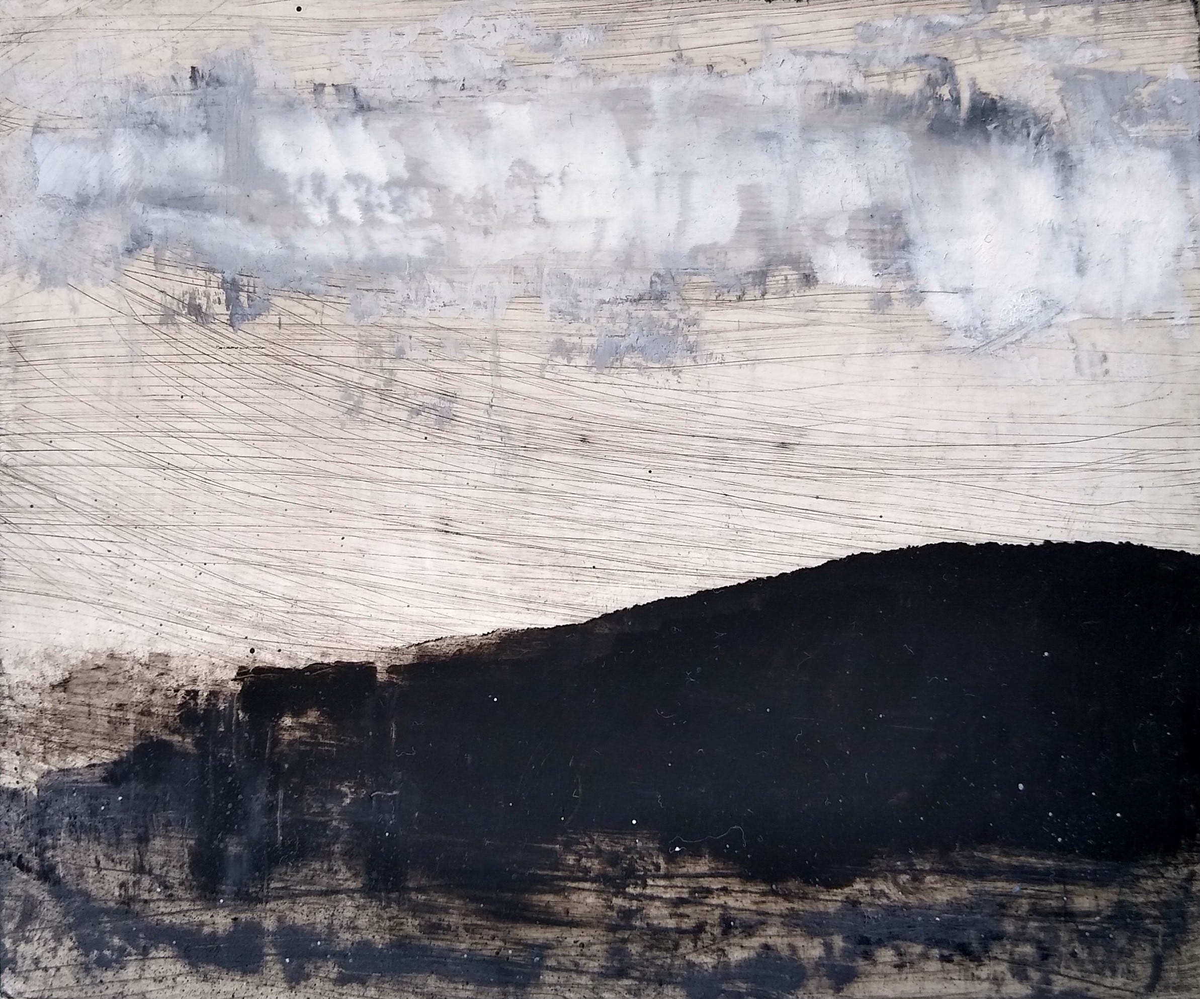 The piece was made by applying oil to a card, scraping the paint off again, sanding it when dry and scoring into the surface. It taught me to not be precious with my materials and see how far they can be pushed. In this case it has taken some of the paint off to reveal the original surface again, but also the scratches and marks left behind give it energy. The energy it gives reflects the energy of the sea and because of the way it was made, it couldn’t be replicated mark for mark.