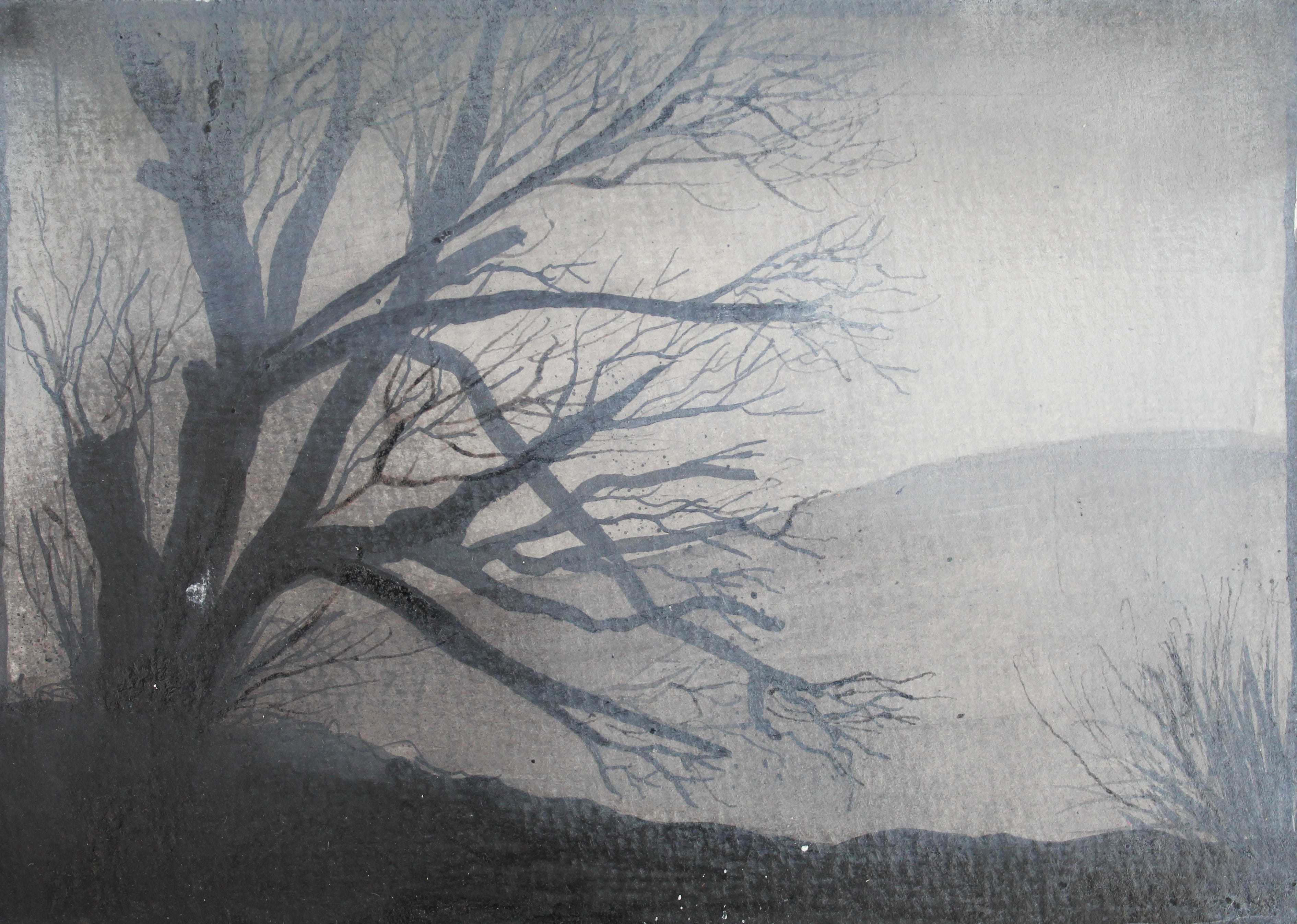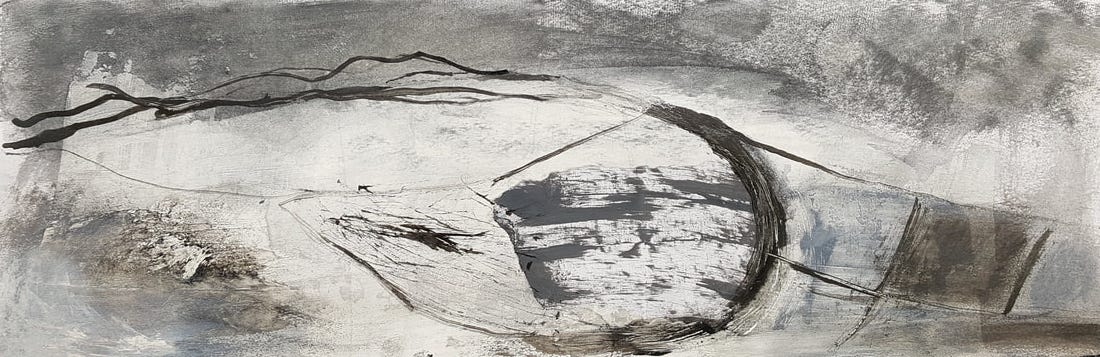 I like to work outside when the Cornish weather will allow. I like to inquire and research my surroundings. This can involve quick sketches, making notes about what I see and hear, thoughts and feelings that come up, photographs, collecting sticks to draw with ink, nature objects like stones or lichen. I then collate all my information in my studio and work from what I have.
