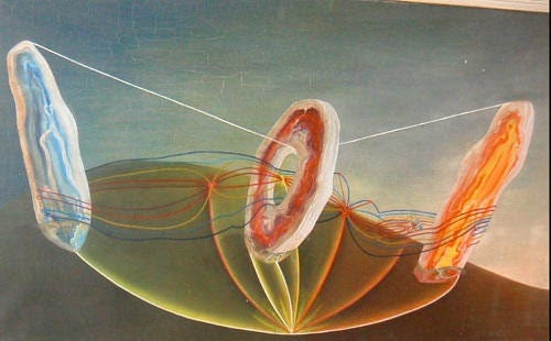 Barbara Hepworth for her work ethic (I also give talks on her at her museum), Ithell Colquhoun, my favourite painting of hers is called ‘Sunset Birth’ showing the energy lines of a figure passing through the local Men-an-Tol stones. In this painting, the outline of a figure is seen passing through the stones. The lines are like energy lines. This is a standout piece to me as it’s like a visual representation of the energy, connection to nature, the stones, the earth and the body. I have also worked through channelling the spirit of a place, inspired by the Ithell Colquhoun, creating more abstract pieces of work.
